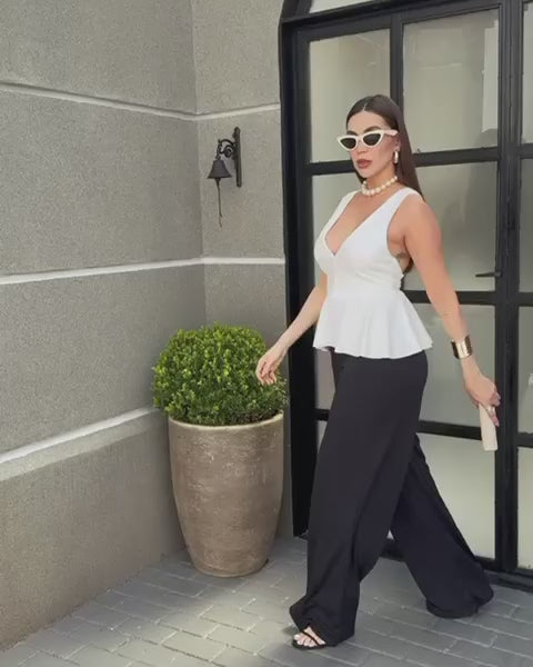 El conjunto ideal para caminar con elegancia: unos pantalones negros de tela elegante y corte holgado crean un efecto de movimiento fluido y elegante al caminar. El pantalón de pierna suelta es una opción chic y cómoda que destaca por su versatilidad y estilo atemporal.