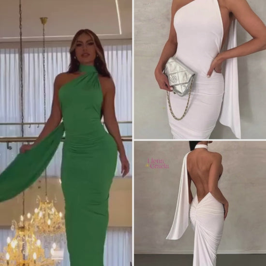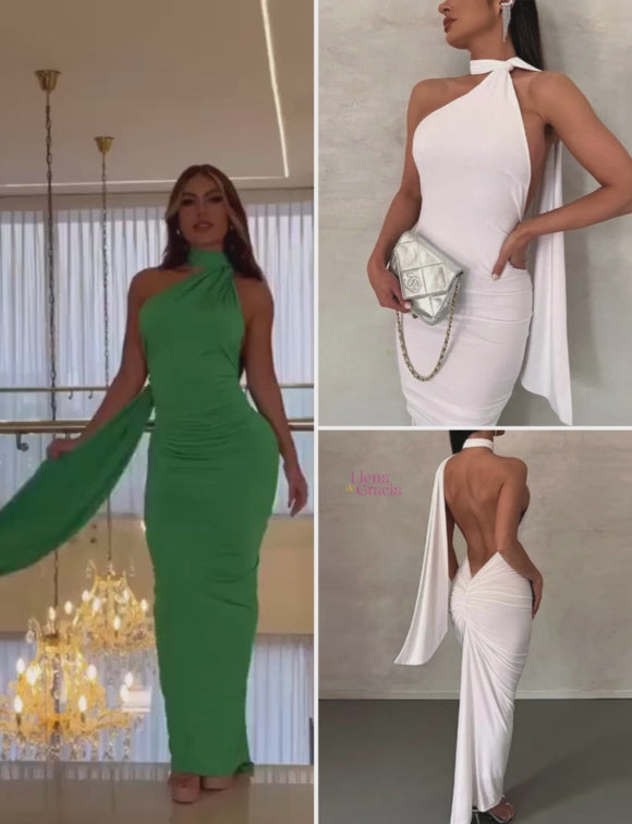 Nuestro elegante vestido largo estilo espalda descubierta, una obra maestra de sofisticación, este impresionante vestido presenta un escote estilo halter que realza tus hombros con gracia y elegancia, mientras que el detalle de nudo a la altura del cuello añade un toque de originalidad y estilo.