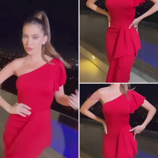 La intensidad del rojo evoca pasión y confianza, mientras que el diseño de una manga añade un toque de originalidad y sofisticación al conjunto. La longitud del vestido crea una silueta estilizada y halagadora que te hará sentir como toda una diva.